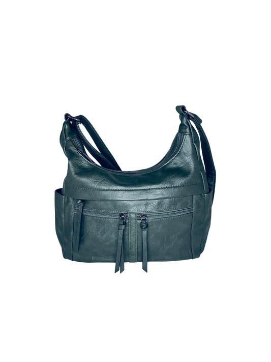 Dámská khaki kabelka ve tvaru gondoly s velkým množstvím kapes
