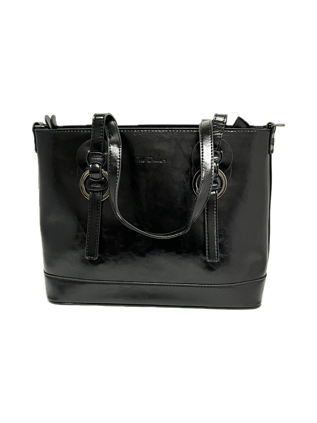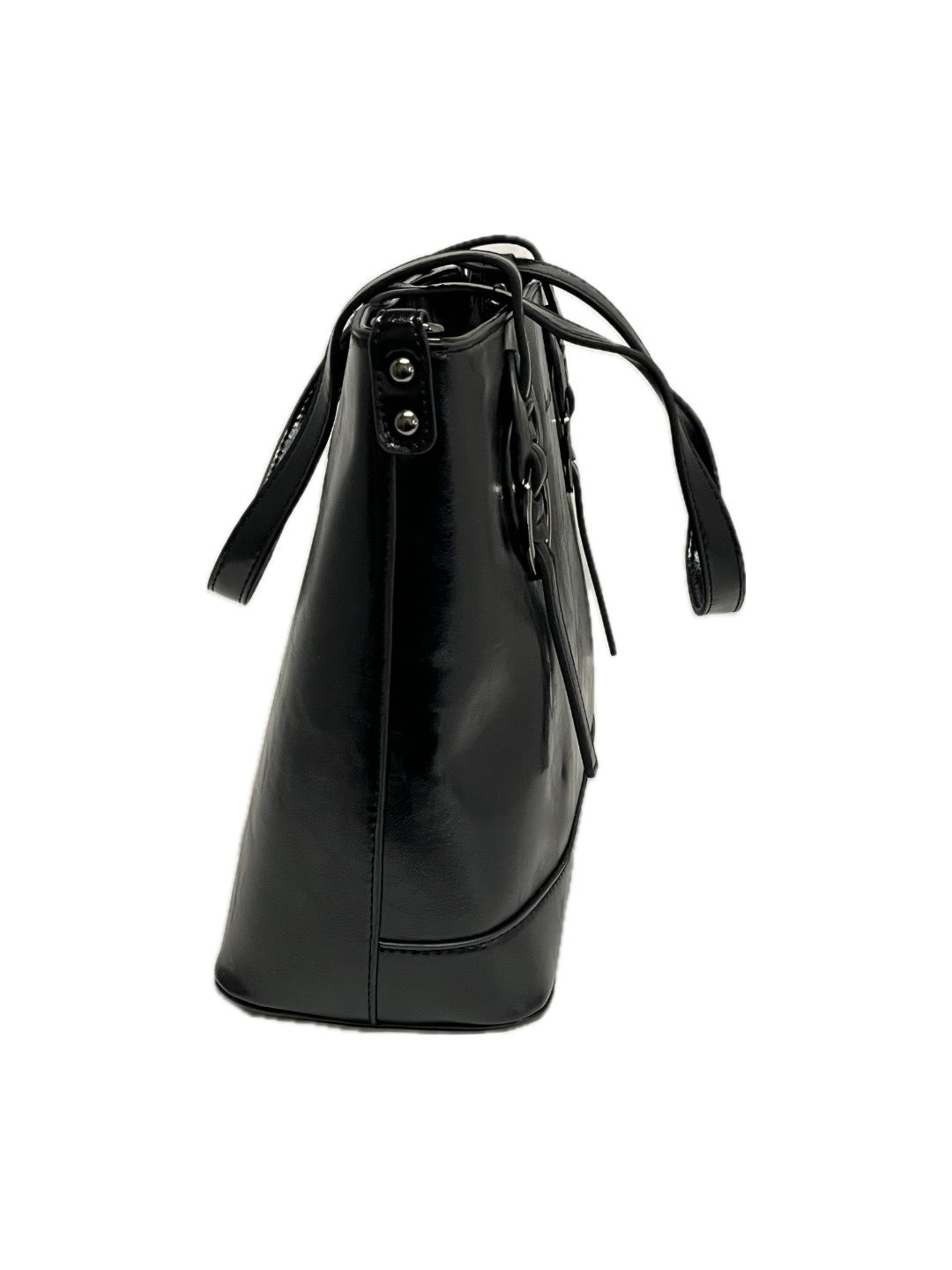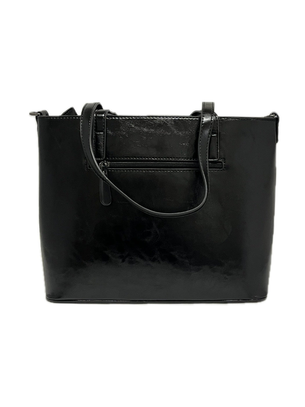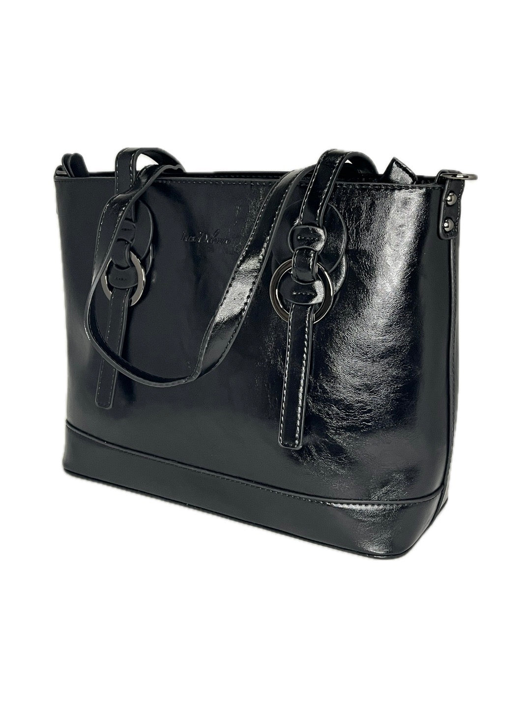 Elegantní shopperka na zip z lesklé koženky dokonale imituje pravou kůži. Dvě dlouhá ucha pro nošení na rameni, další délkově nastavitelný lze připnout či odepnout. Kabelka je členěná na tři oddíly, z nichž je jeden uzavíratelný zipem. Vnitřní část kabelky je vybavena bezpečnostní kapsičkou na zip a dvěma malými pohotovostními. Na zadní straně tašky je další kapsa.