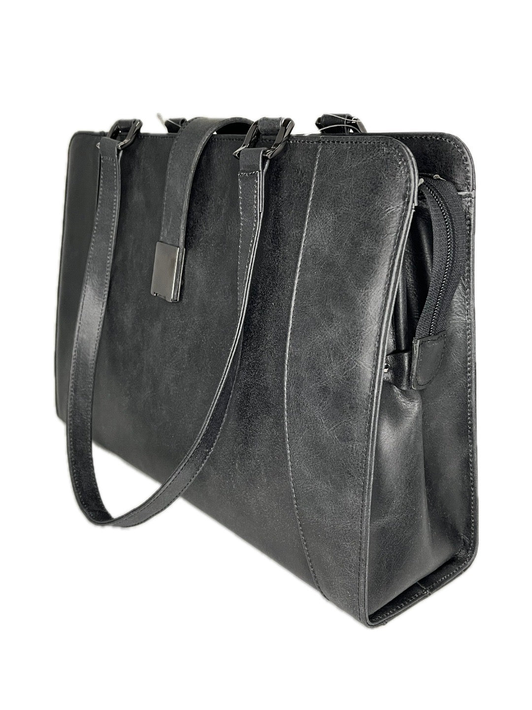 Elegantní dámská taška českého výrobce je vyrobená z kvalitní kůže, uzavíratelná zipem, opatřená dvěma plochými držadly přes rameno. Dvě hlavní kapsy jsou odděleny mezistěnou na zip, výklopná kapsa na samostatně stojící dokumenty. Další zipová kapsa, další kapsa na mobilní telefon, přihrádka na vizitky a tři poutka na tužky. Délka držadel 60 cm. Antracitově šedá.