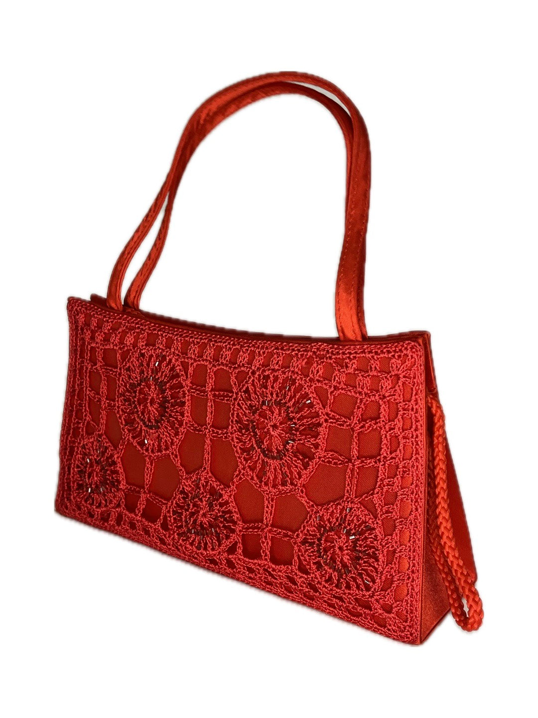 Společenská kabelka s roztomilým krajkovým motivem. Lze nosit i na rameni na provázkovém popruhu, který diskrétně schováte do kabelky.