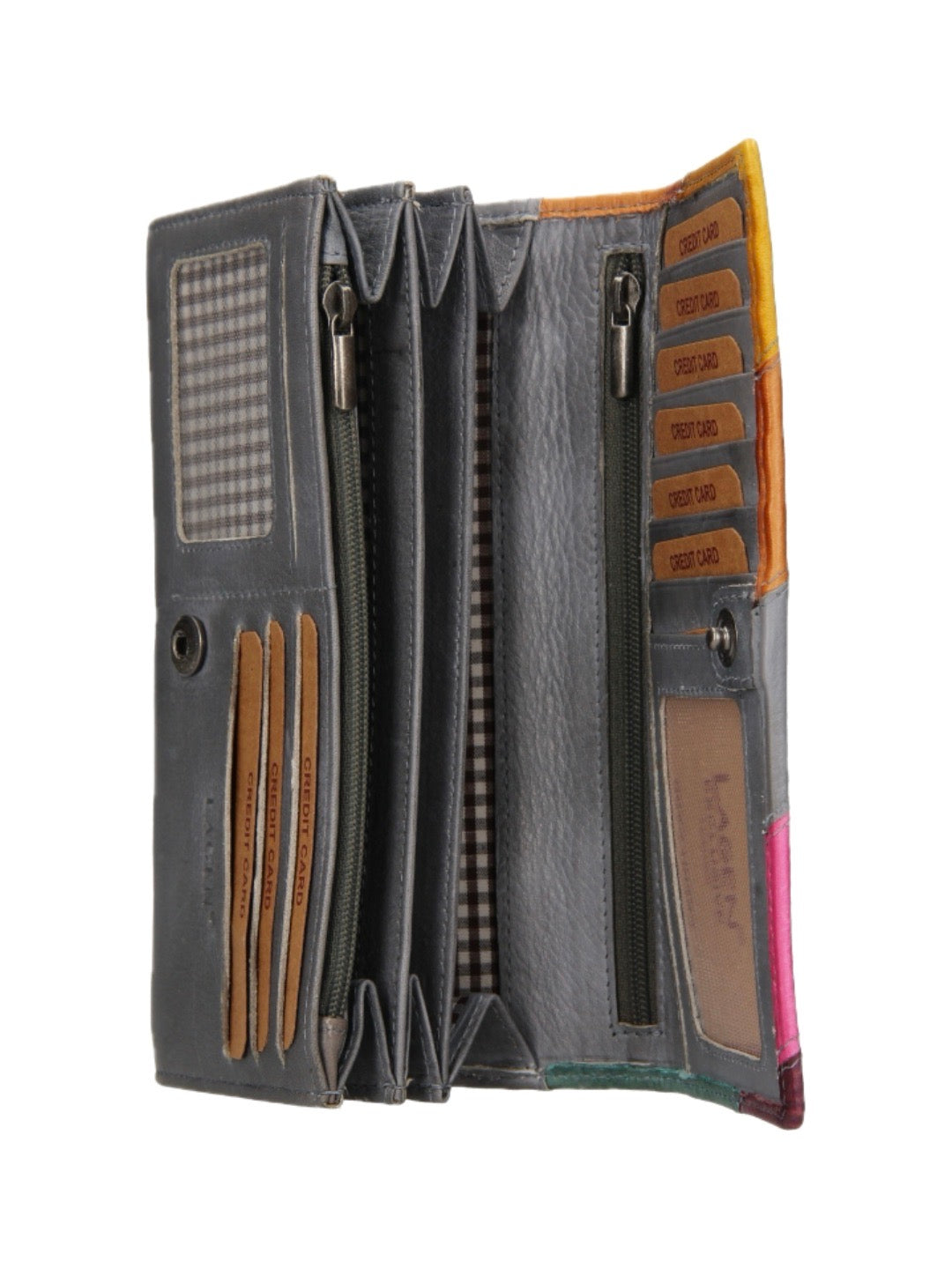 Elegantní dlouhá peněženka disponuje šesti přihrádkami na karty, jednou průhlednou na fotky, čtyřmi přihrádkami na bankovky, jednou zipovou vnitřní diskrétní kapsou a zipovou kapsou na mince. Na zadní straně kapsa se zapínáním na zip. Zapínání na cvoček.