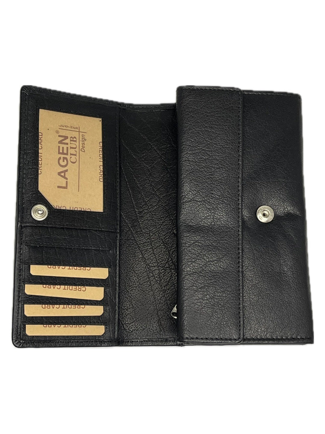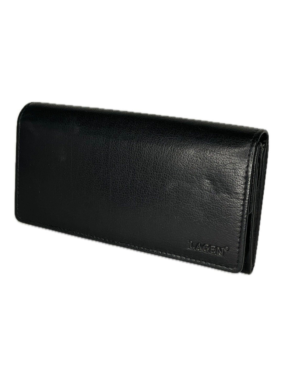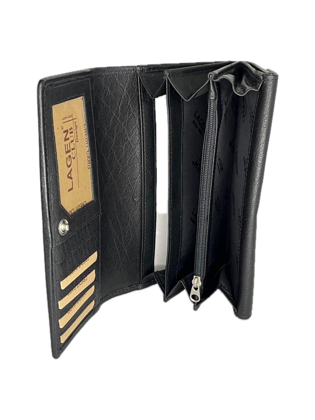 Kožená peněženka české firmy Lagen. 3 přihrádky na bankovky, 5 na doklady a 6 na karty. Přihrádka na mince uzavíratelná klopnou s magnetem.