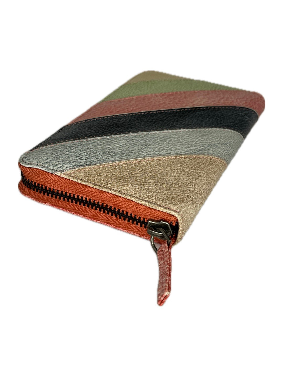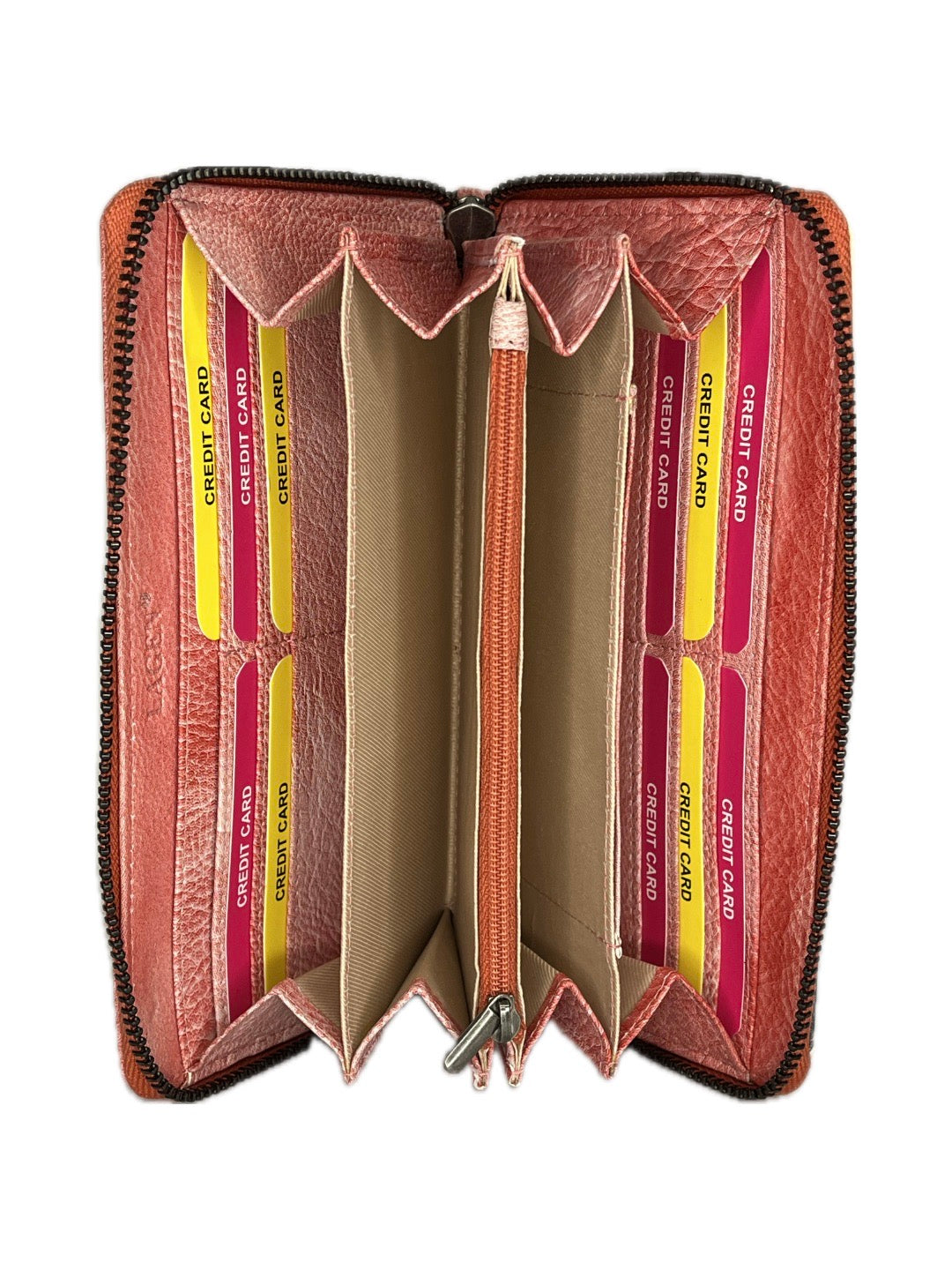 Dámská kožená peněženka typu "penál" českého výrobce LAGEN. Má jednu vnější přihrádku na zip, tři přihrádky na doklady, čtyři na bankovky a dvanáct na karty. Přihrádka na mince je uzavíratelná zipem, stejně jako celá peněženka.