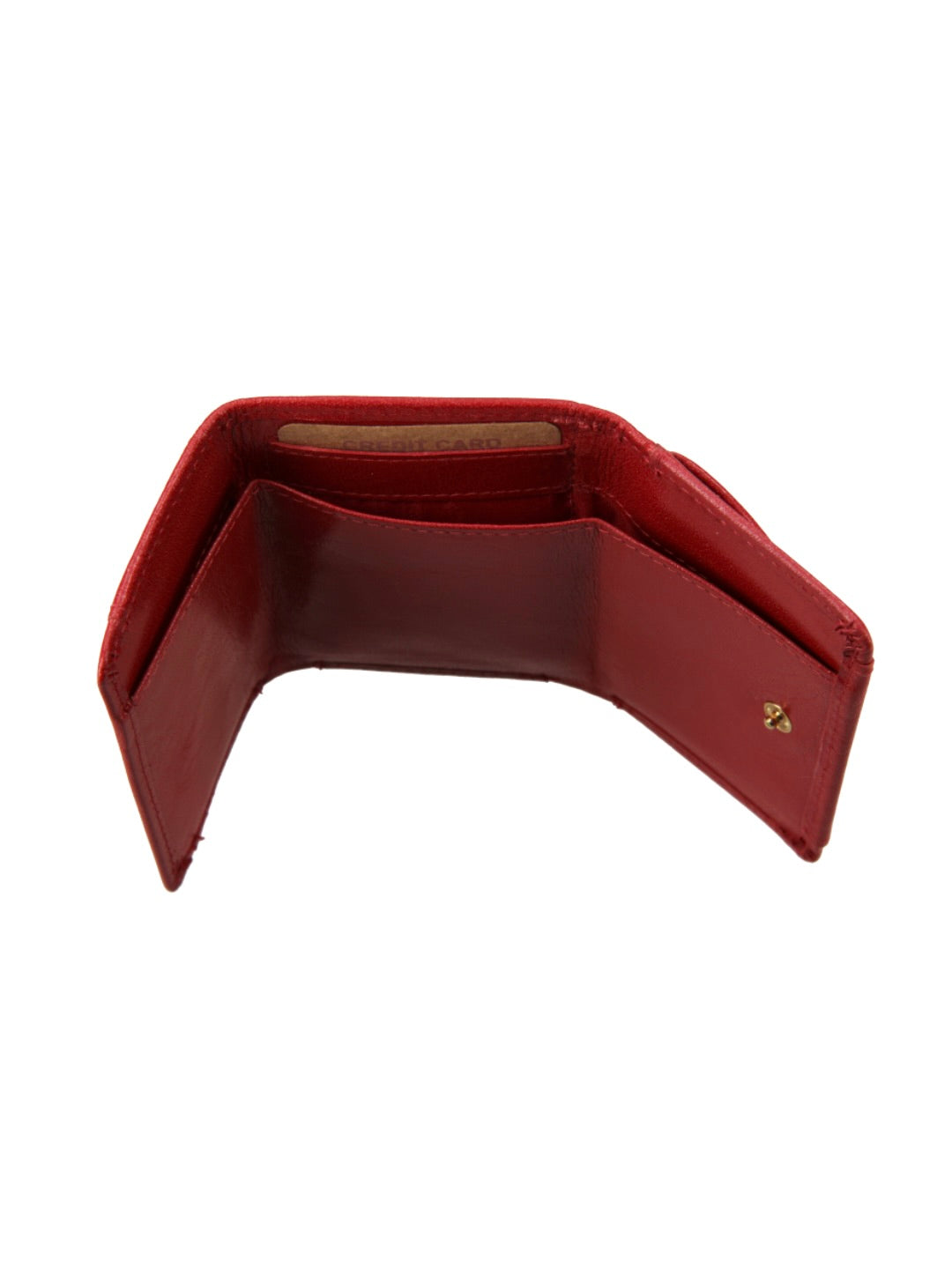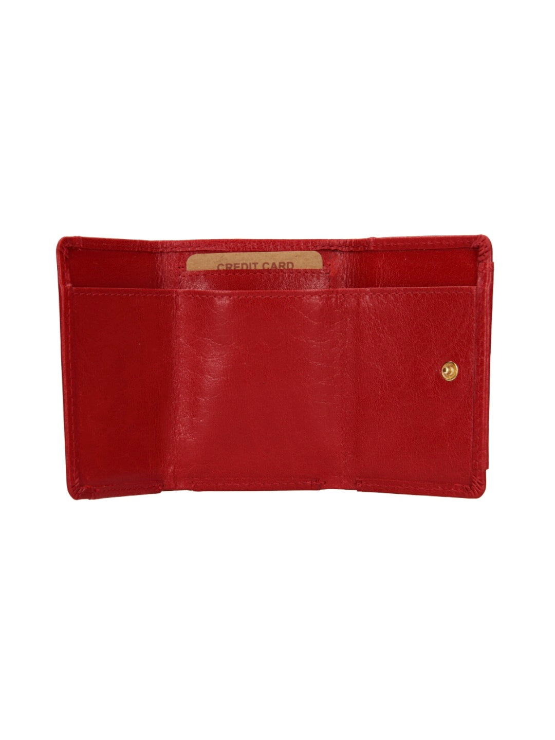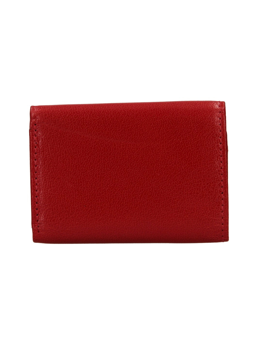 Malá kožená cestovní peněženka. Jedna přihrádka na bankovky, dvě na karty a jedna na mince.