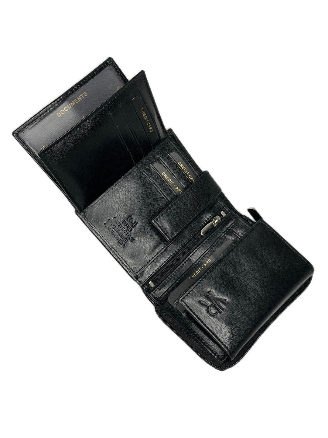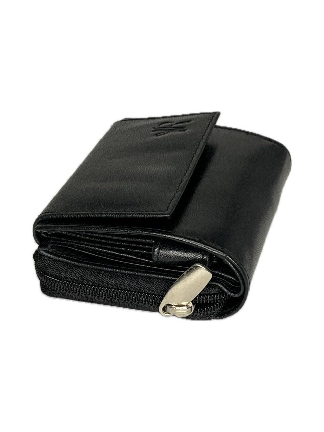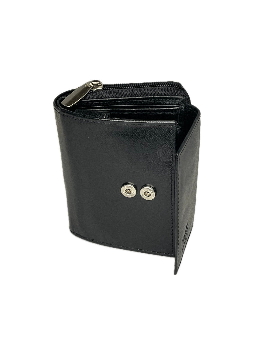 Menší dámská peněženka z pravé kůže, funkce RFID pro ochranu karet je samozřejmostí. Přihrádka na mince má dva oddíly na drobné, jeden na zip a další oddíl na kartu. Dva oddíly na bankovky a 17 na karty. Zapínání na dva druky, můžete podle obsahu peněženky zvolit variantu.