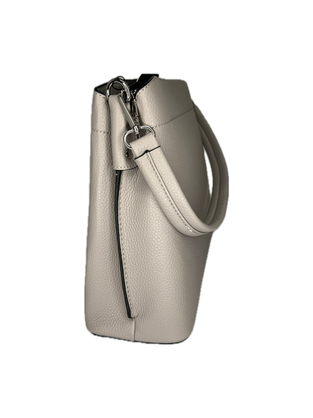 Netradiční zpracování dámské tašky. Měkká ale drží tvar, dostatek vnitřního prostoru. Hlavní prostor kabelky se uzavírá zipem, uvnitř tři oddíly, z toho jeden uzavíratelný zipem. Jedno krátké ucho do ruky, jedno dlouhé přes rameno a jeden efektní látkový popruh přes rameno.