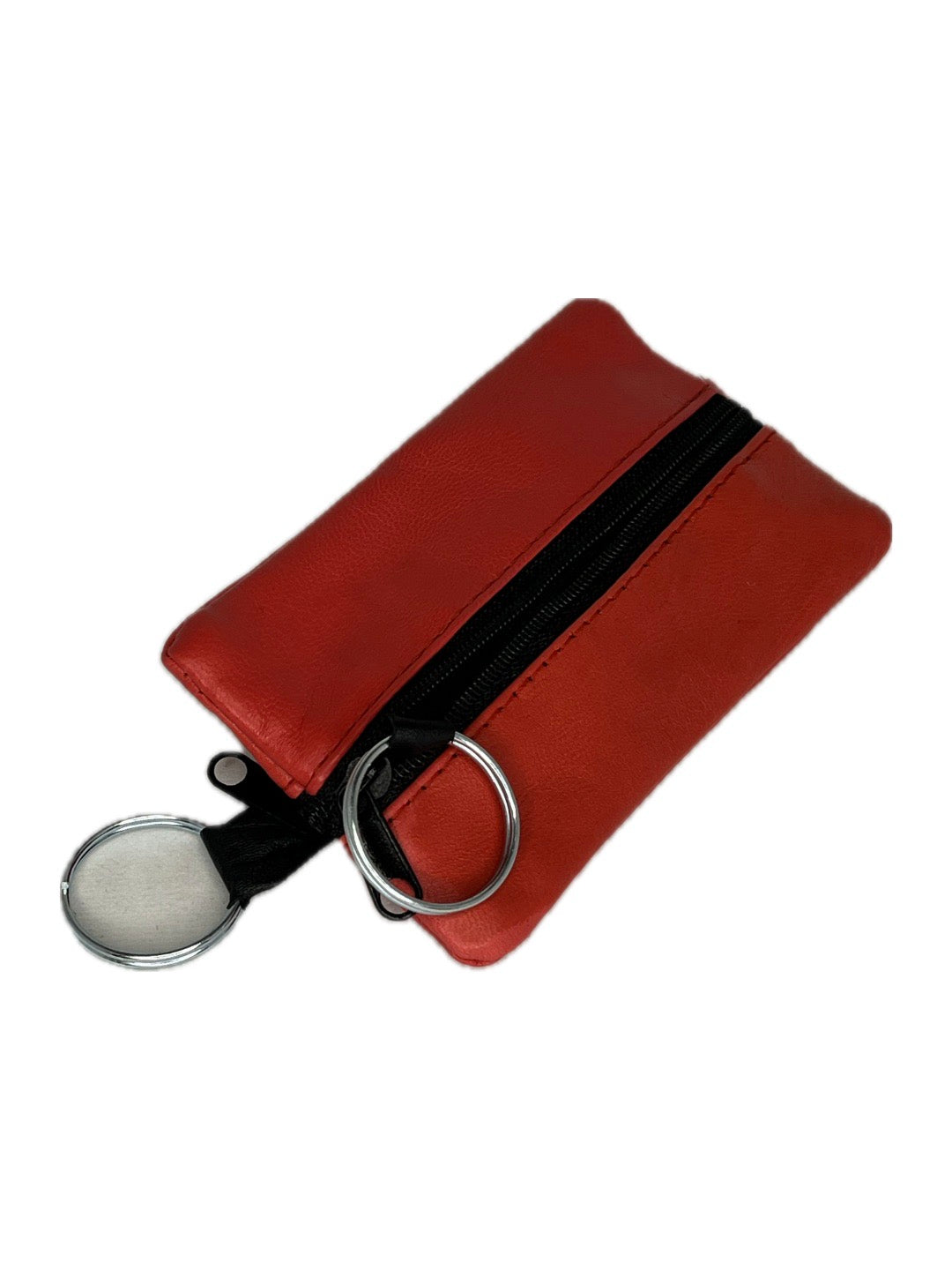 Kožená klíčenka má na obou stranách zip, v každé z kapsiček je poutko s kroužkem na klíče.