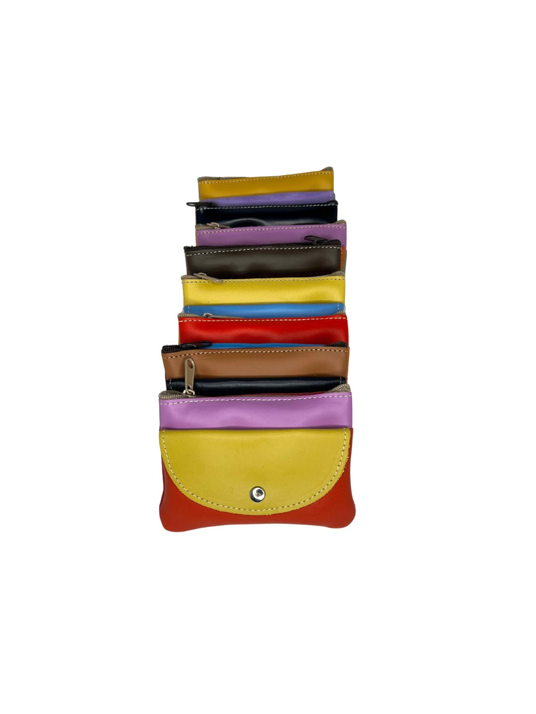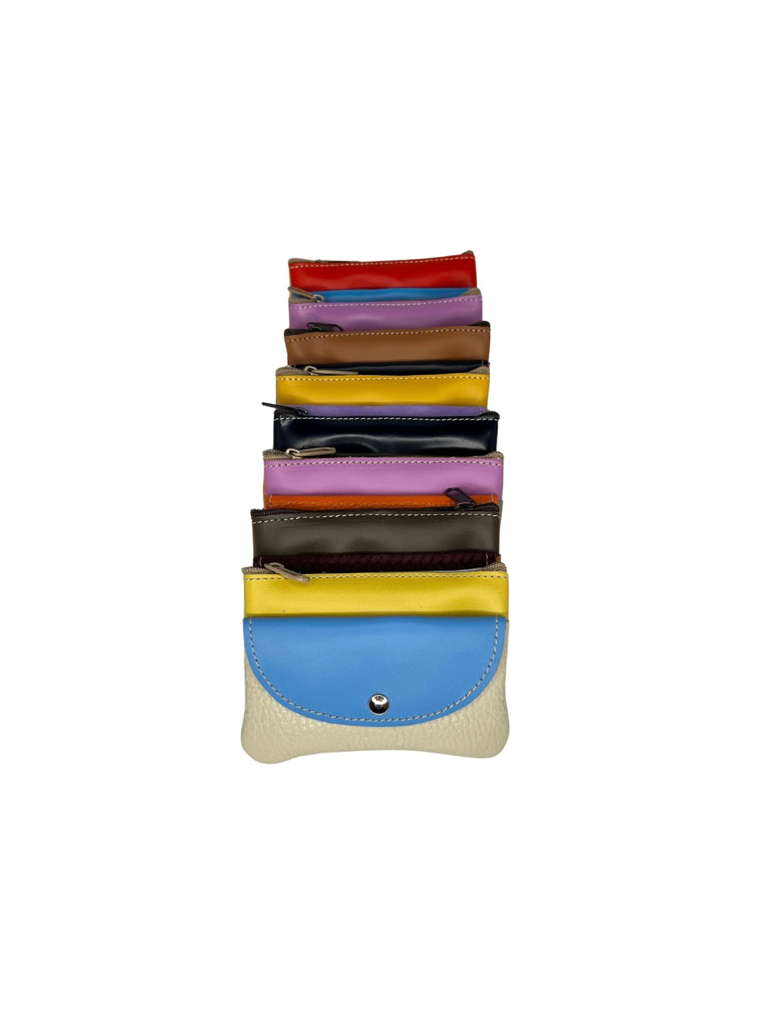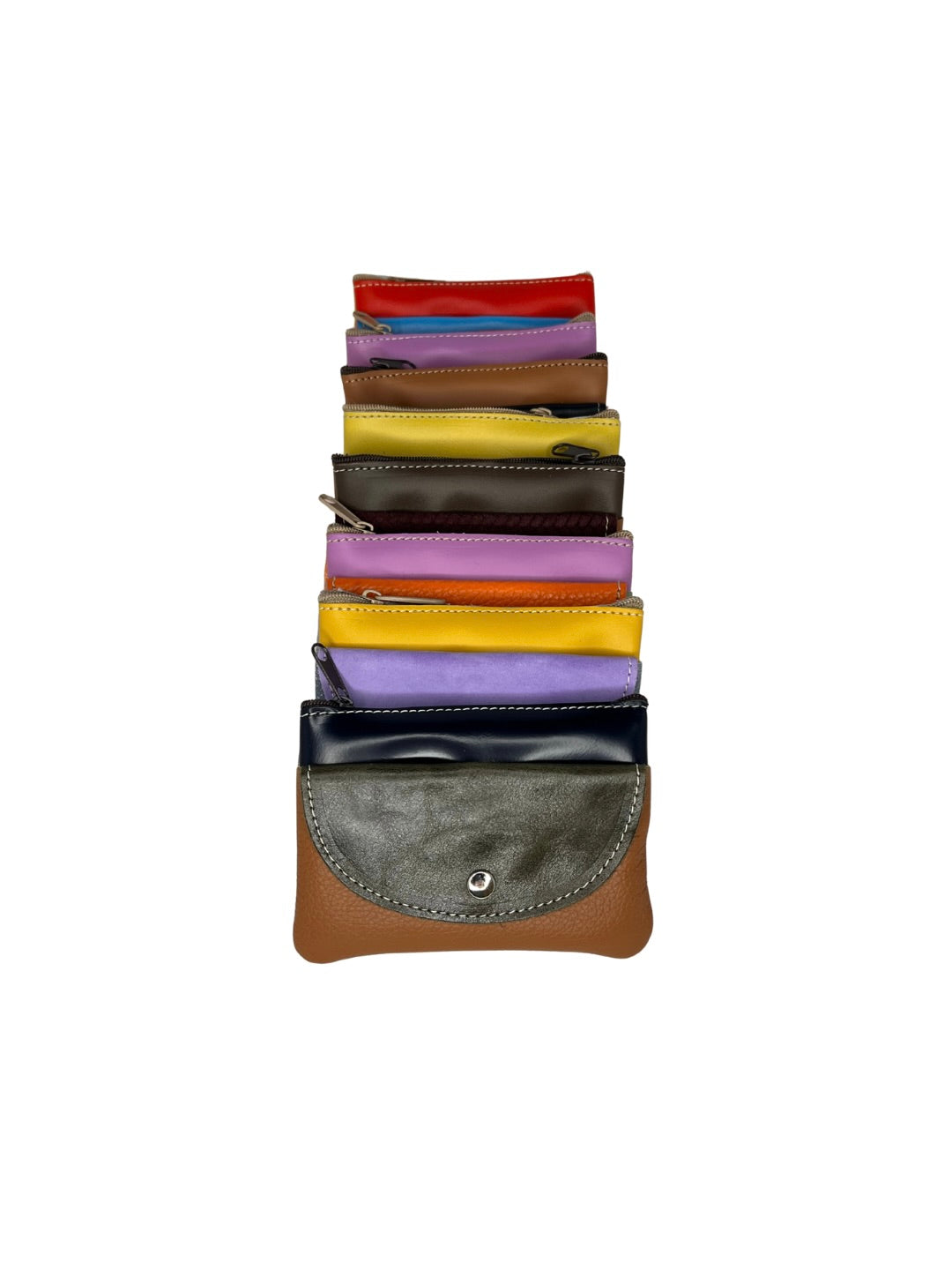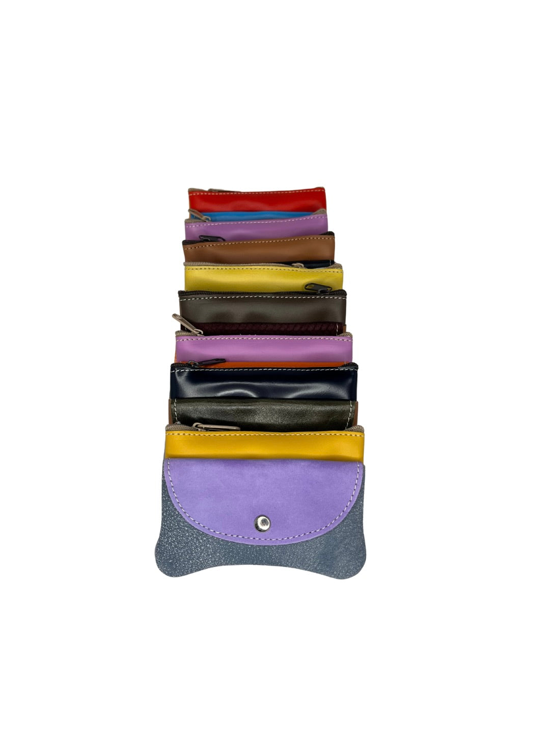 Maličká kapsička na zip, kombinovaná z barevné kůže. Kombinace jsou různé, nelze vybrat konkrétní vzor.