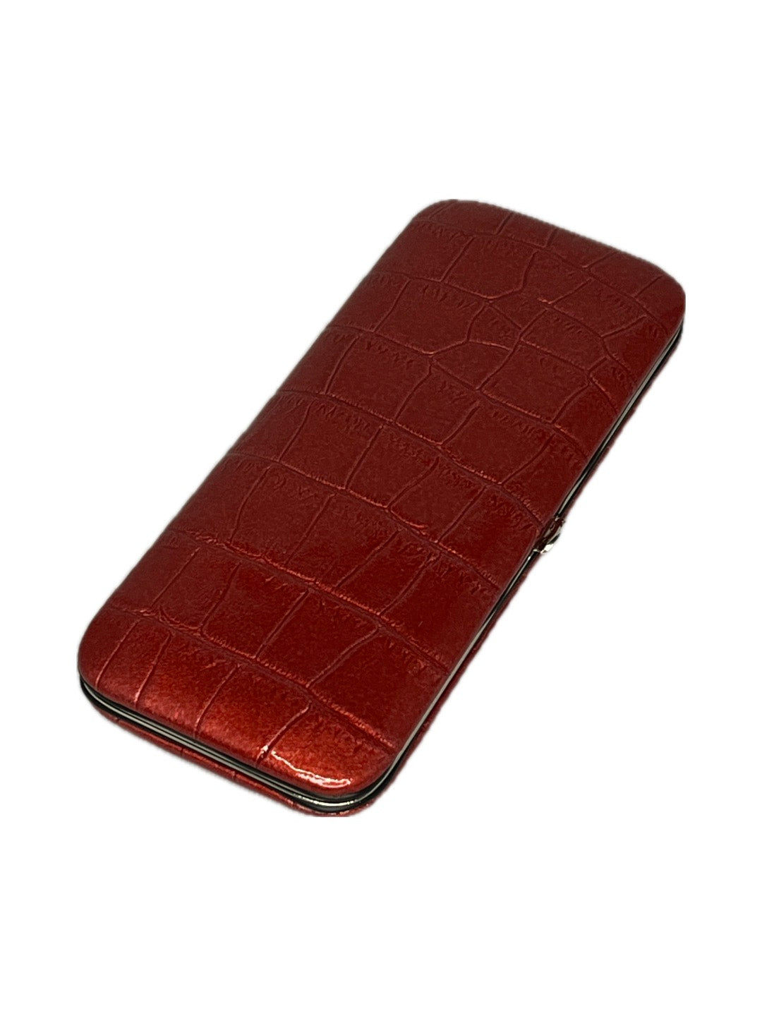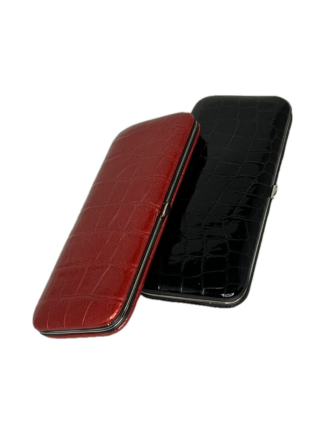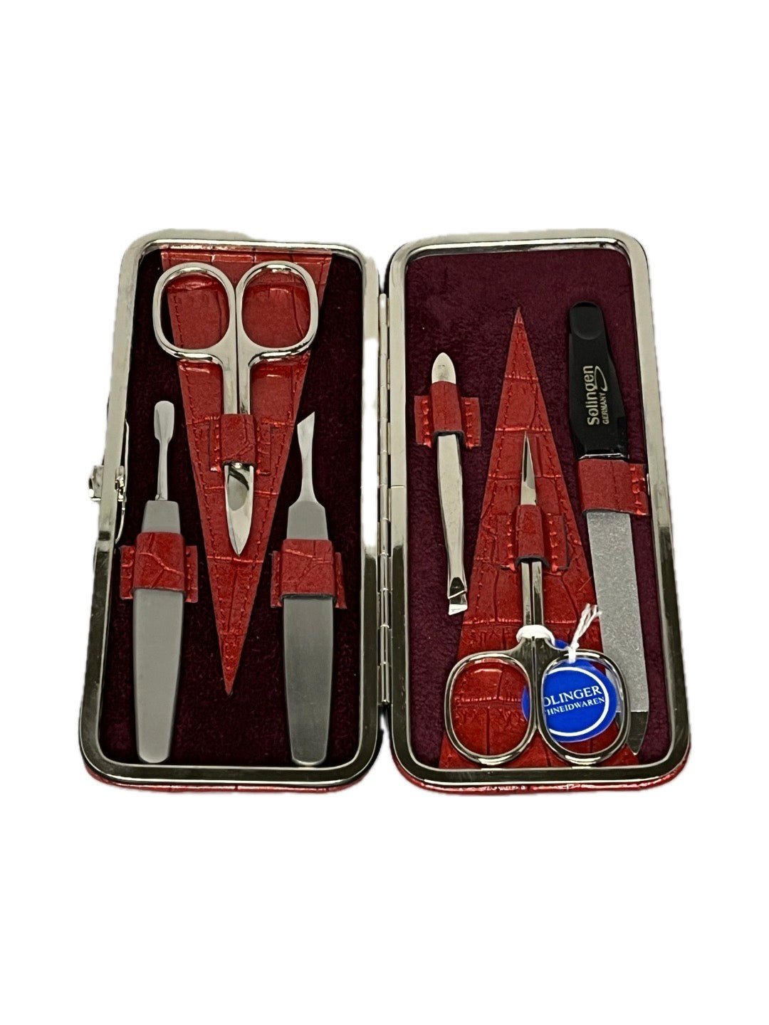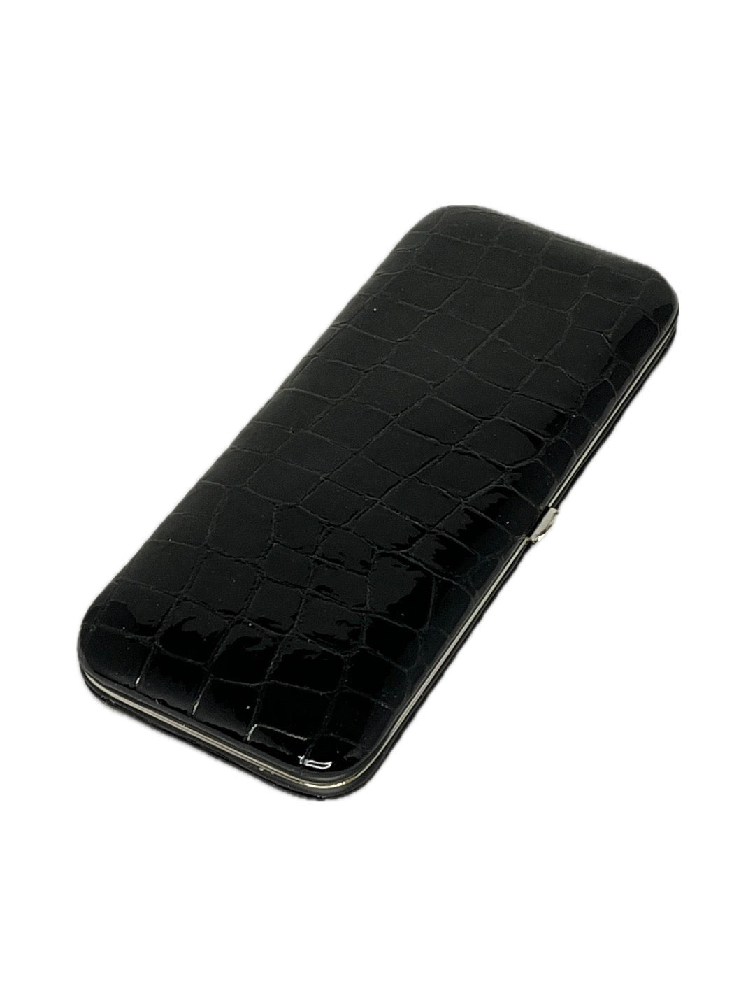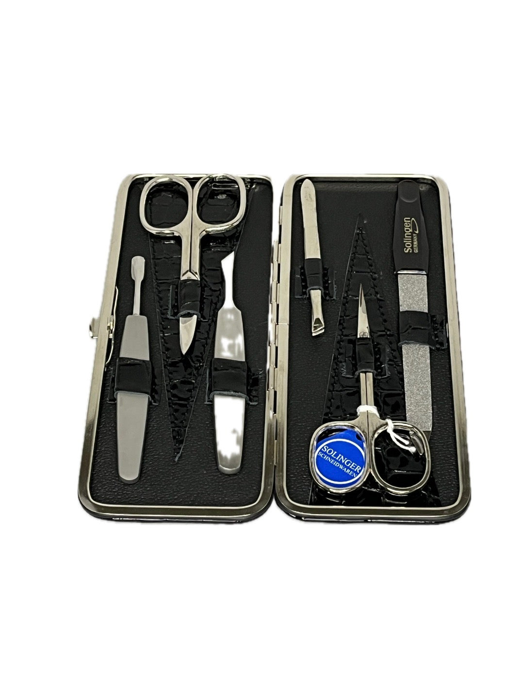 Domácí manikúra v koženém lakovaném pouzdře s kovovým rámečkem, české výroby, vybavená kvalitní německou ocelí značky Solingen, úprava oceli nerez lesk.