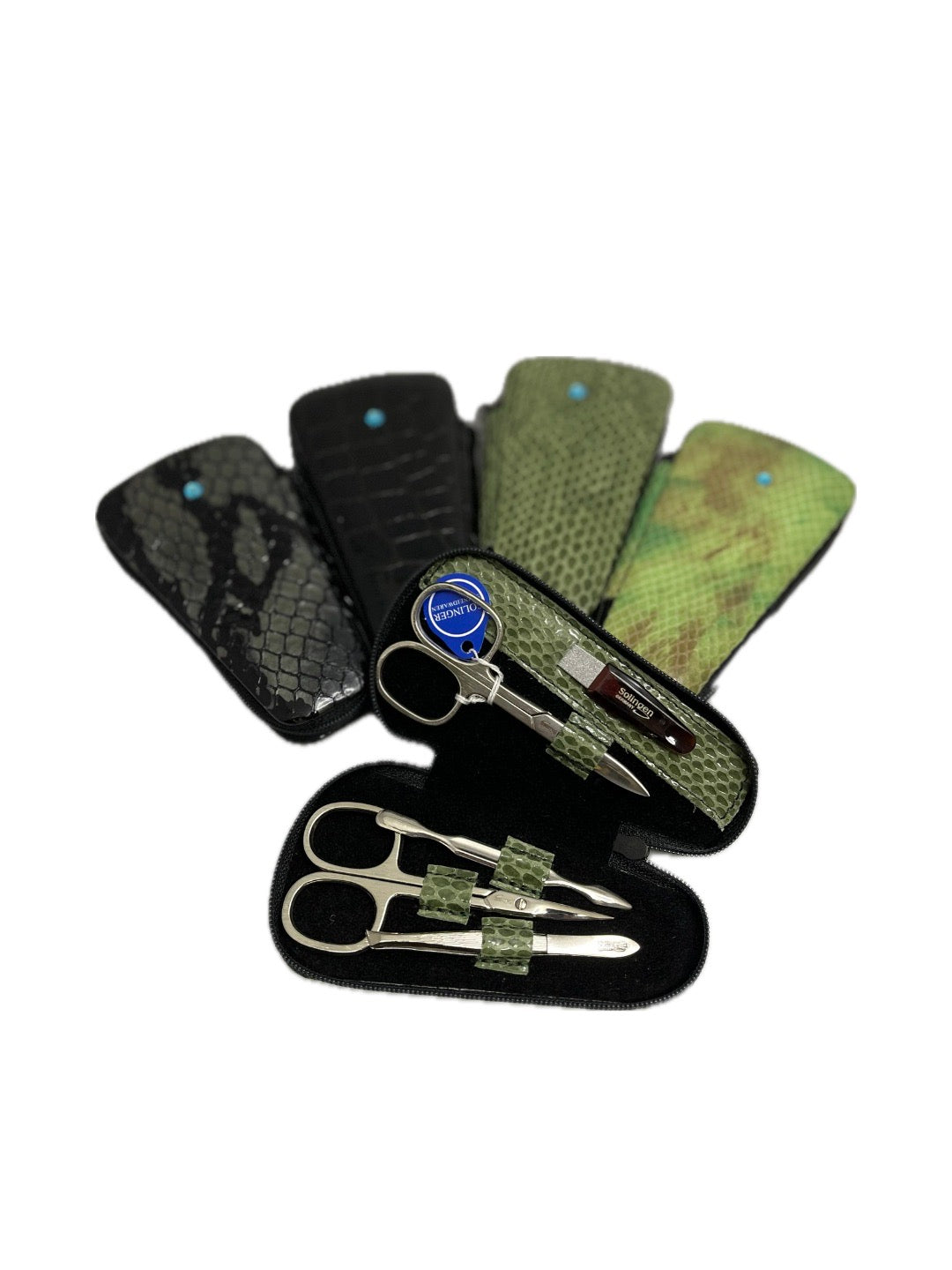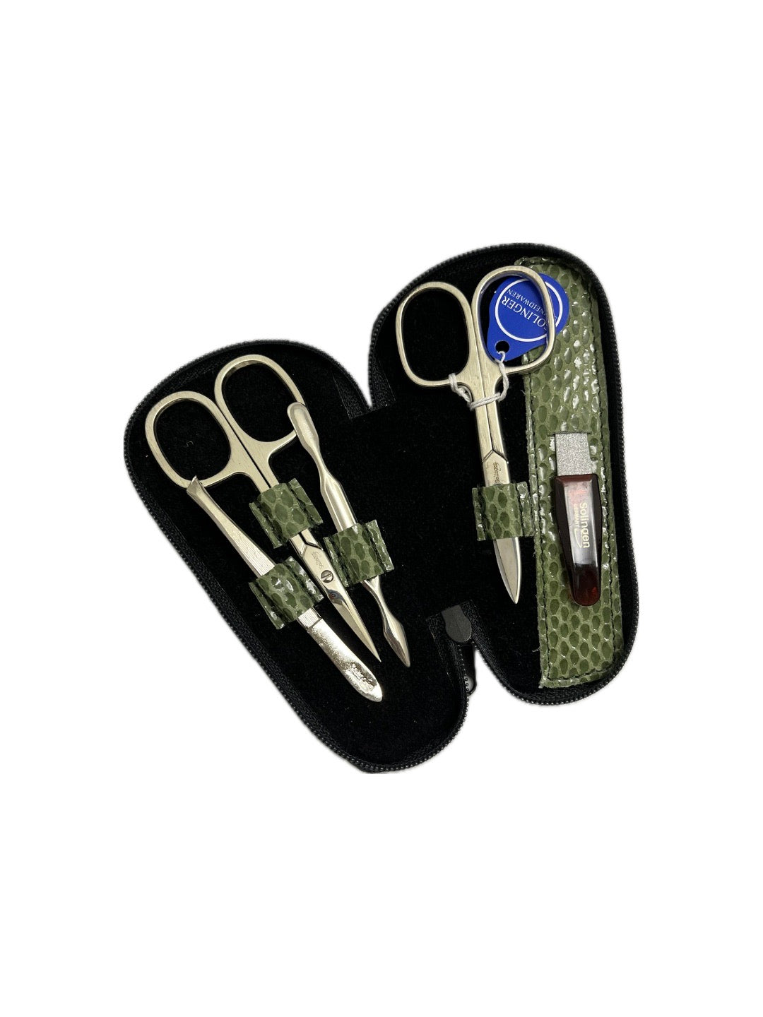 Domácí manikúra v koženém pouzdře české výroby, vybavená kvalitní německou ocelí značky Solingen, úprava oceli nerez lesk.