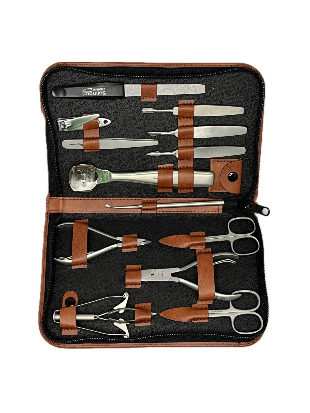Profesionální manikúra v koženém pouzdře české výroby, vybavená kvalitní německou ocelí značky Solingen a Professional, úprava oceli nerez mat.