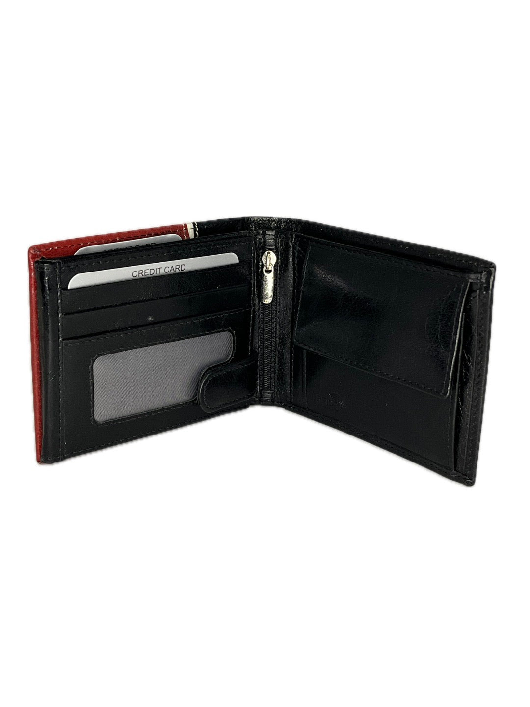 Elegantní nadčasová pánská peněženka z kvalitní kůže, kombinace červené a černé vypadá velice efektně. Přihrádka na mince, dvě na bankovky a 13 na karty. Funkce RFID na ochranu karet.
