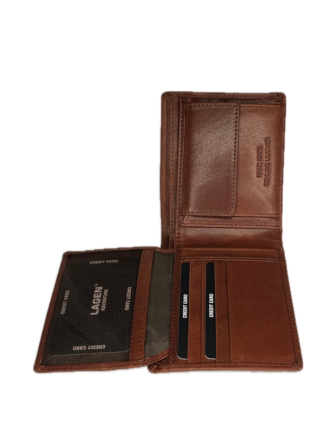 Pánské peněženky Lagen nabízí kromě elegance, ruční výrobu a nekompromisní kvalitu. Uvnitř najdete prostor pro uložení bankovek, dokladů, kreditních karet a mincí. Tato peněženka je situovaná na šířku. Dvě přihrádky na bankovky, čtyři na doklady a osm na karty.